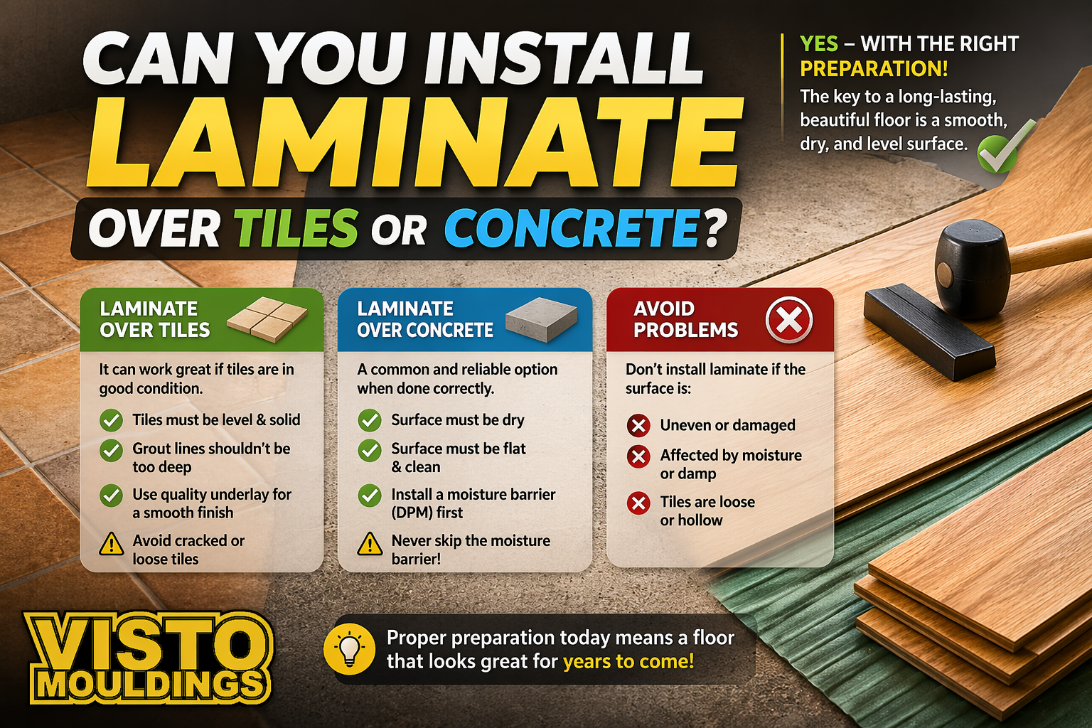 Yes — you can install laminate flooring over both tiles and concrete, but only if the surface is properly prepared. At Visto Moulding, we often help homeowners across Pretoria and Gauteng achieve a professional finish by ensuring the correct installation methods are followed.